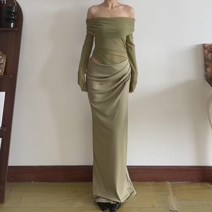 Mujer introduces the Off-Shoulder Mesh Patchwork Maxi Dress with Ruched Detail, a captivating statement piece designed for unforgettable celebrations. Crafted from smooth polyester-elastane with delicate sheer mesh patchwork panels, this dress creates an alluring balance between elegance and seduction. The off-shoulder slash neckline frames the décolletage beautifully, while thoughtful ruching contours the silhouette in all the right places. Flowing to ankle length with long sleeves, this dress embodies sophistication for birthday celebrations, evening soirées, and festival nights.