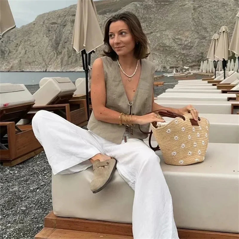 Mujer introduces the V-Neck Tailored Bow-Tie Vest, a refined layer crafted to elevate minimalist styling with effortless charm. Made from smooth, lightweight polyester, it delivers a clean structure and soft touch. The sleeveless cut and single-breasted line sculpt a modern silhouette with subtle femininity. Versatile for year-round wear, it transitions seamlessly from polished daytime looks to understated evening elegance.
